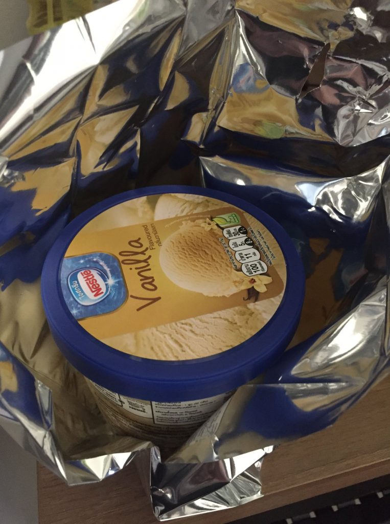 Di dalam aluminum pack ini berisi aiskrim.  Setiap kali beli aiskrim maka cashier akan ambil aluminium foil khas dan masukkan aiskrim tadi ke dalamnya.