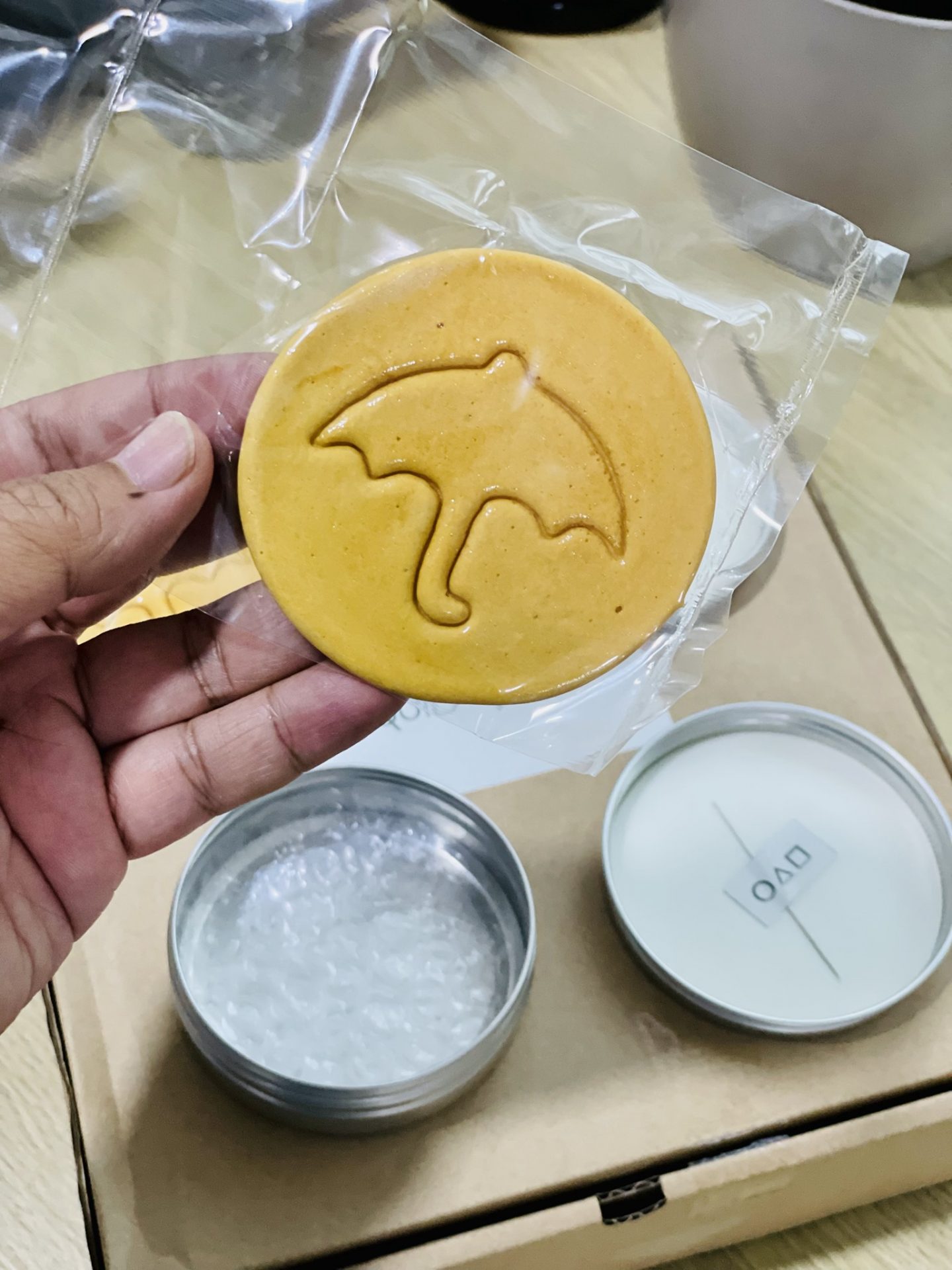 Anak-anak aku suruh aku buat honeycomb atau dalgona candy Squid Game tu. Katanya, cairkan gula dan masukkan baking soda dan kacau sebati, tuang atas piring lepas tu tekapkan corak payung …