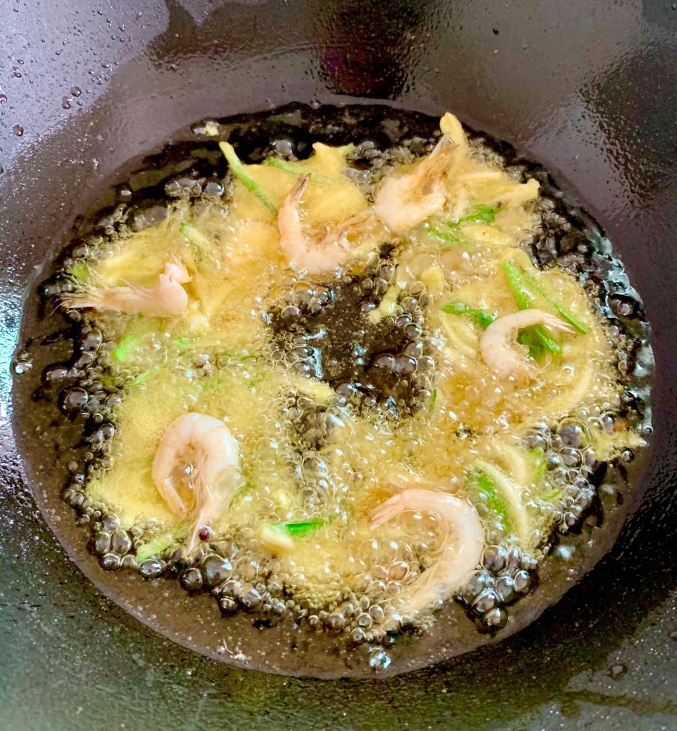 2. Ceduk adunan ke dalam kuali sampai penuh mungkin 5-6 biji dan terjunkan seekor udang ke atas cucur tadi setiap satu. Kemudian terus perlahankan api dan biarkan cucur masa sampai perang keemasan.