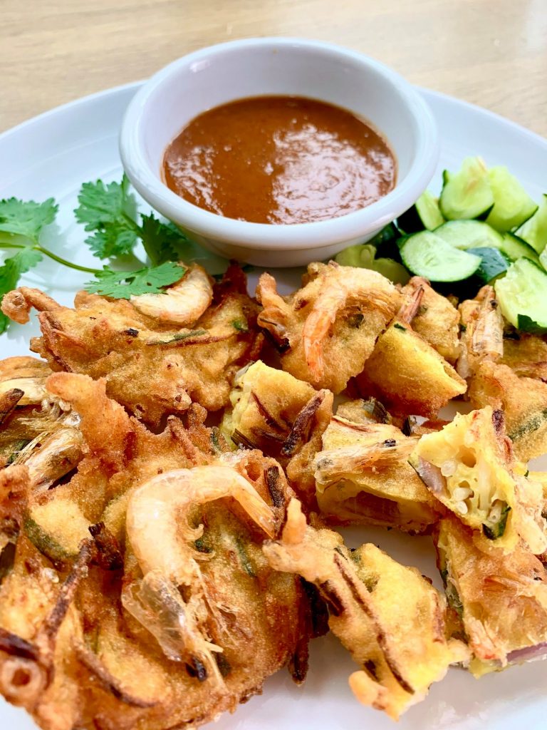Ini cucur udang atau coq udang kata orang utara. Kami makan cicah dengan kuah kacang dan hirisan timun. Buat sendiri gini memang dapat makan sampai puas.