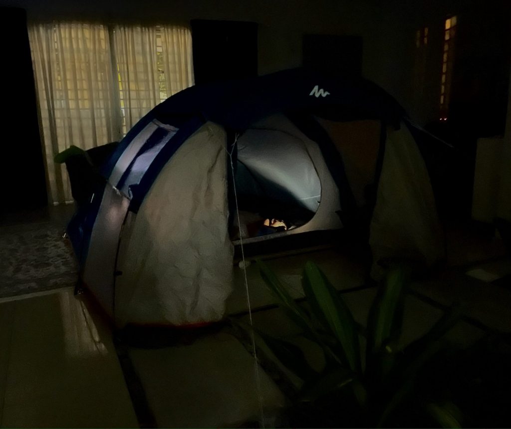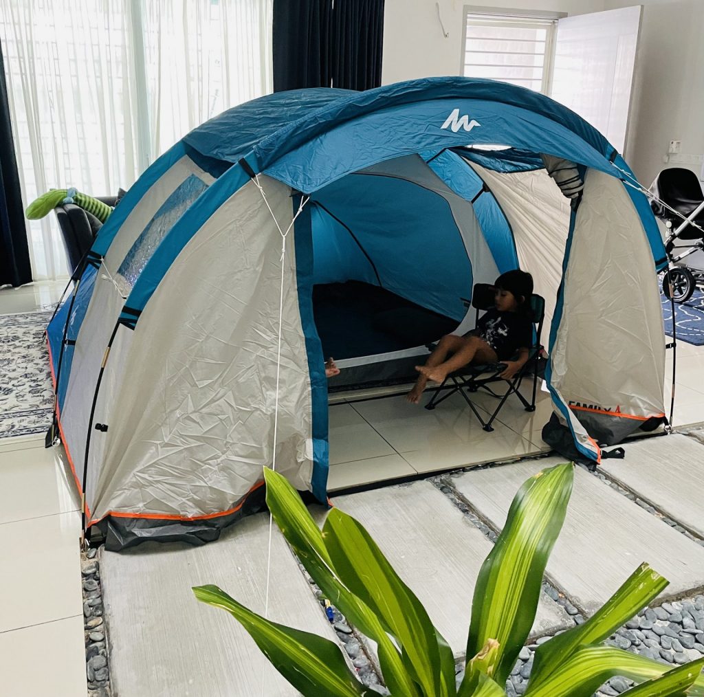Mujur beli khemah 4 orang punya, ngam-ngam lah kami 4 beranak. Nak pasang dia pun takdelah susah sangat. Just nak masukkan 3 besi frame dia lepas tu tarik tali tegang. Siap.