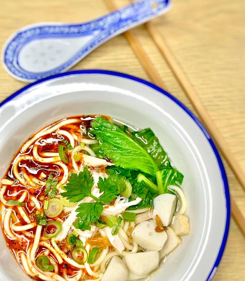 Lepas tu potong dan celur sayur.  Masuk mee dalam mangkuk dan hidangkan dengan sup simple tadi.  Tambah fishball dan fishcake dengan isi ayam.  Potong daun bawang dan daun sup lalu tabur bawang goreng.