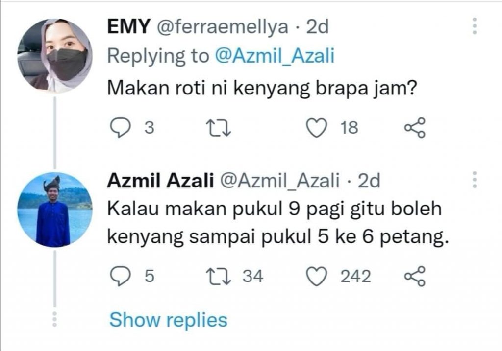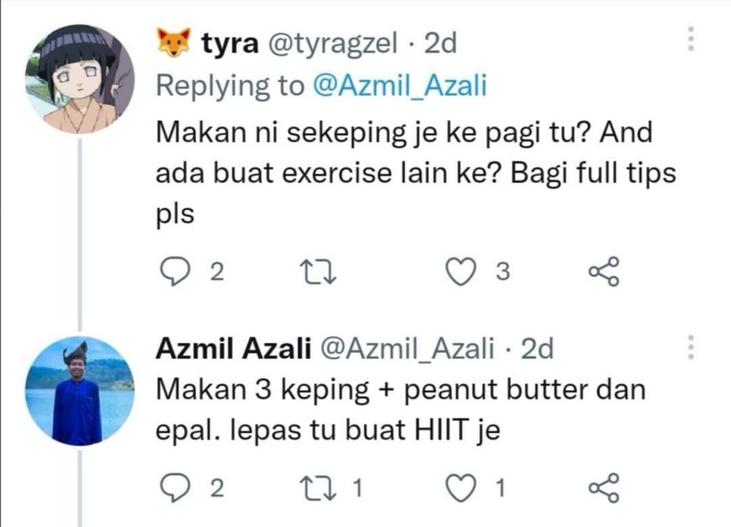 So, bila brader tu kata dia makan roti ni setiap pagi dan kurus maka make sense jugak. Dia makan pagi 3 keping dan kenyang tu membawa sampai ke petang. So dia dah kurang makan, lepas tu ditambah dengan HIIT (High intensity interval training) maka dia hilang 20kg dalam masa 3 bulan.