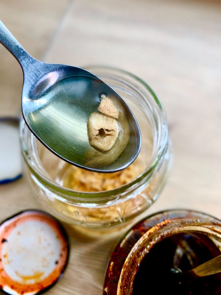 Paling best, tiap kali kau nak makan nasi panas, kau ceduk sesudu kecil garlic oil dan sesudu kecil chilli oil tu kau gaulkan. Makan dengan ikan pekasam atau ikan masin pulak.