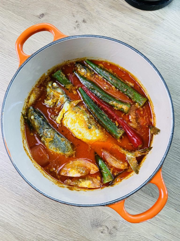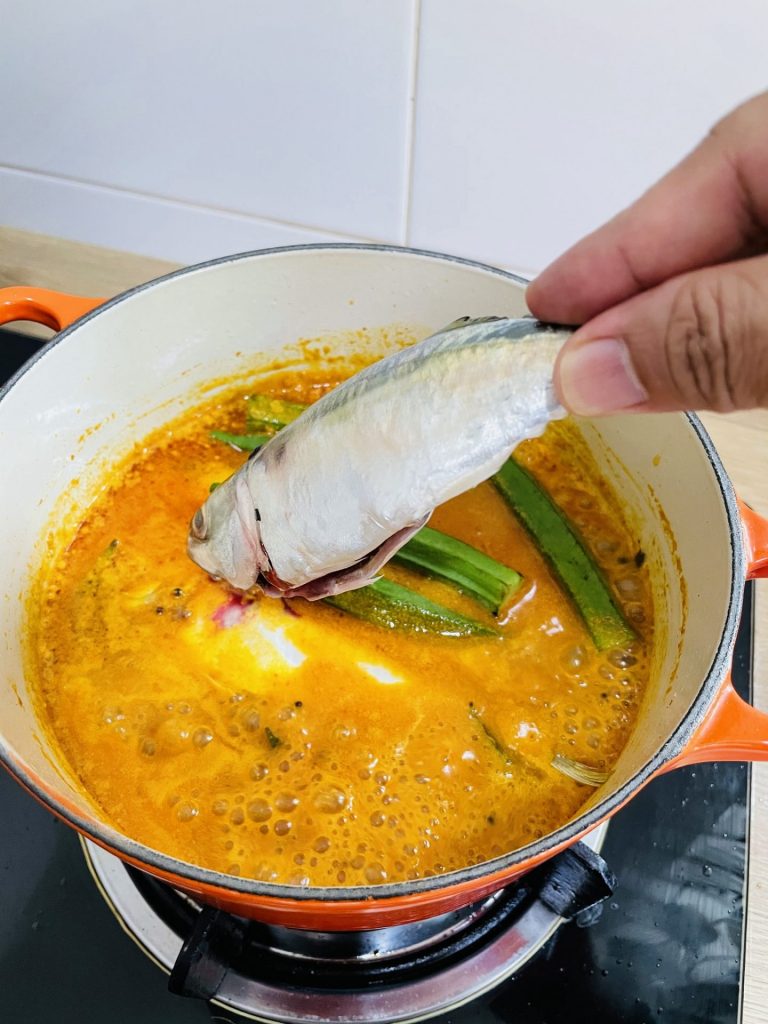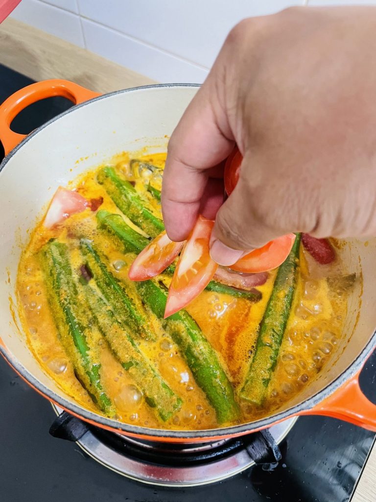 4. Kemudian masukkan ikan dan bendi. Biarkan mendidih lagi sekali lagi barulah masukkan tomato dan biarkan seminit lalu tutup api.