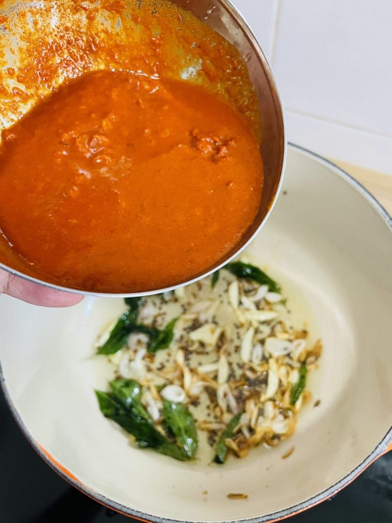 2. Bila bahan tumis dah garing elok maka masukkan pes rempah kari tadi dan kacau sampai pecah minyak. Make sure pecah minyak ok. Bila nampak minyak dah keluar tu maknanya dah pecah minyak.