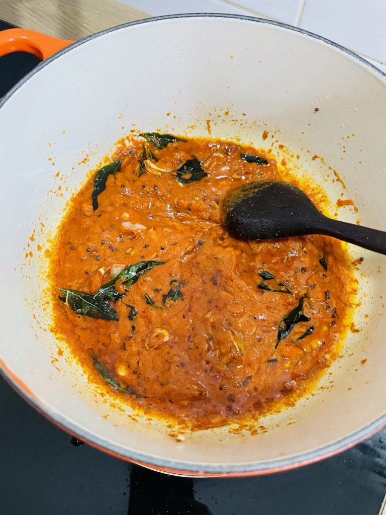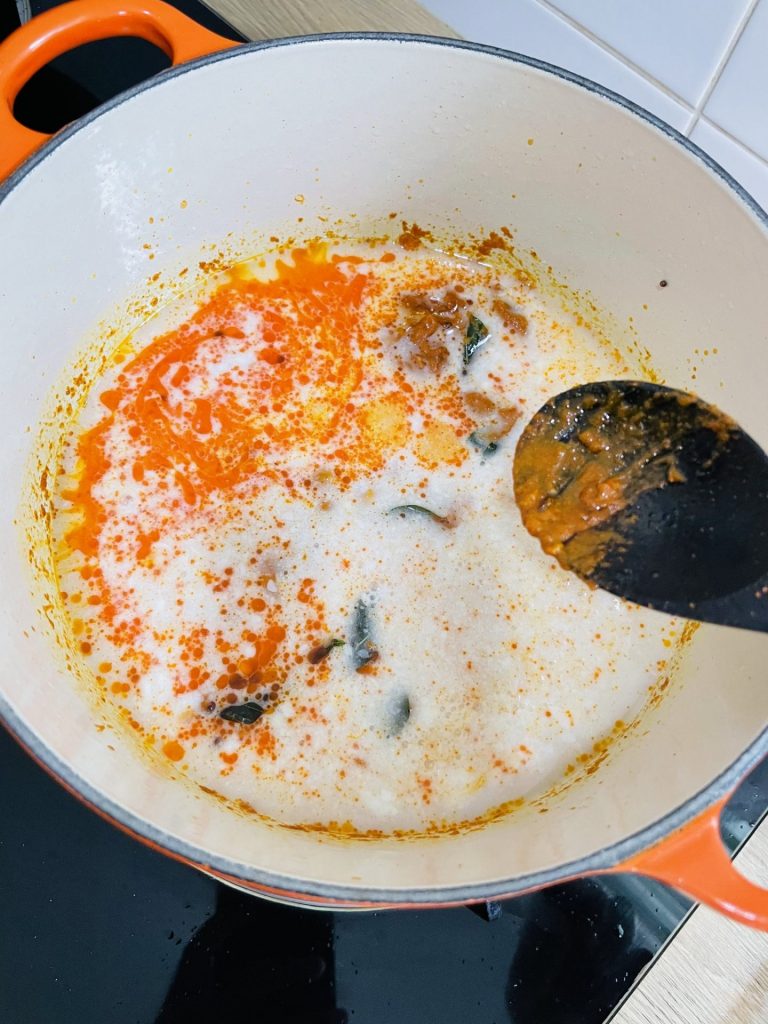 3. Kemudian masukkan santan, air, garam, asam jawa dan kacau sebati. Biarkan mendidih. Dah didih perlahankan api dan kacau sekejap sampai nampak minyak naik ke atas.