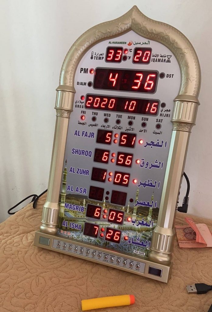 Sedap suara dia. Dah azan dia boleh iqamah sekali lepas tu. Senang nak set waktu azan, kalendar pun boleh pilih nak kalendar hijrah ke masihi. Nak set alarm pun boleh juga tau. Suhu bilik pun ditunjukkan sekali.