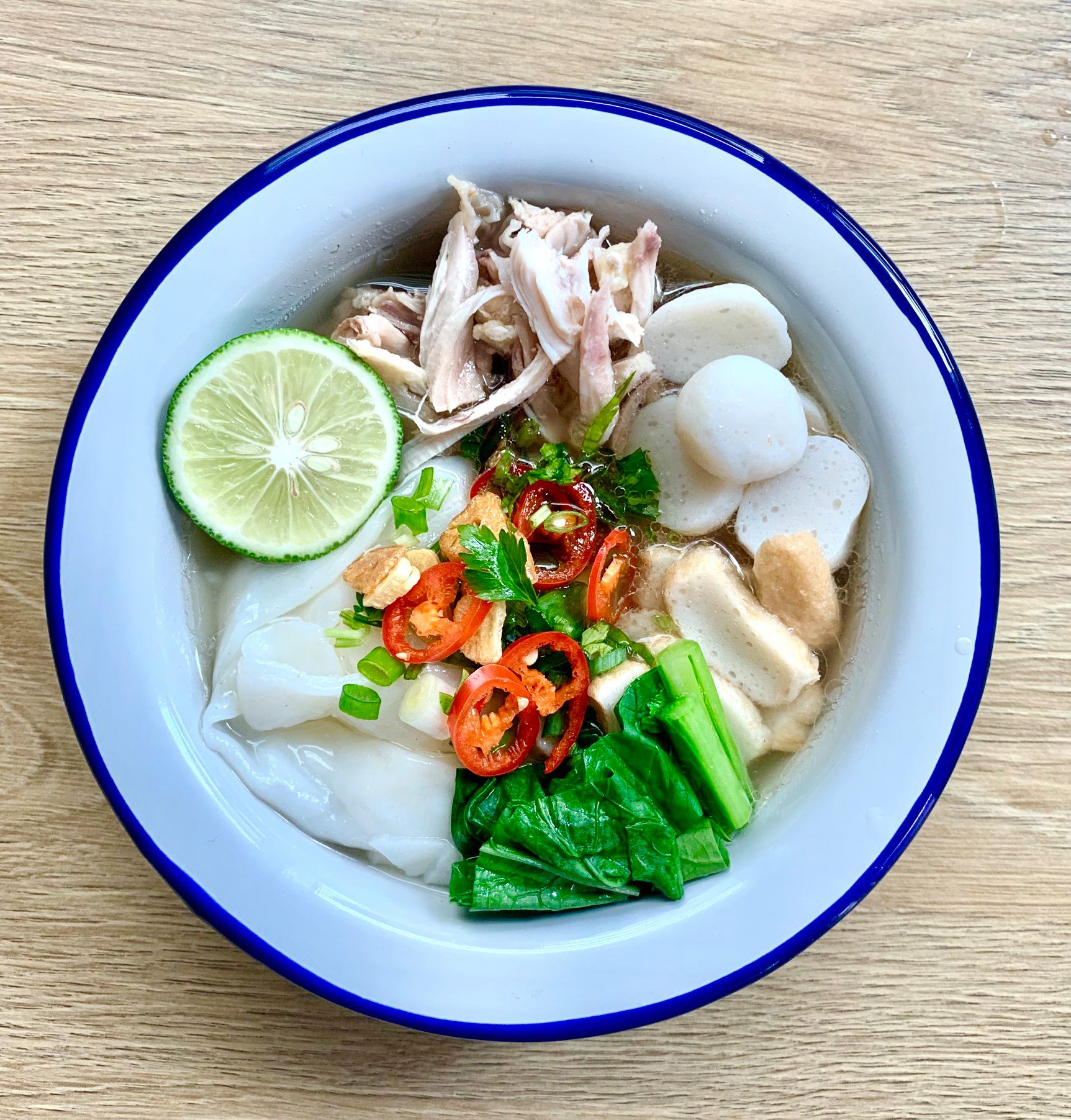 7. Kau hidangkanlah. Masukkan kowteow, tuang sup, lepas tu masukkan minyak bawang putih, masukkan sambal kicap, masukkan sayur dan hias dengan daun bawang dan daun sup. Potong limau letak tepi.