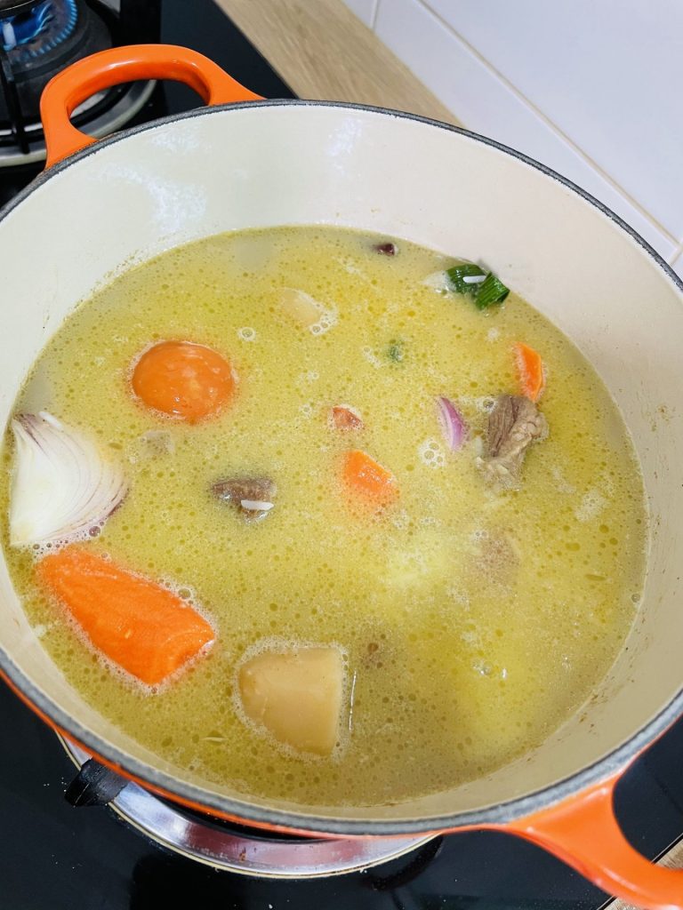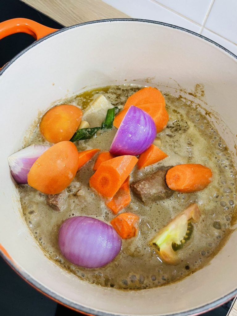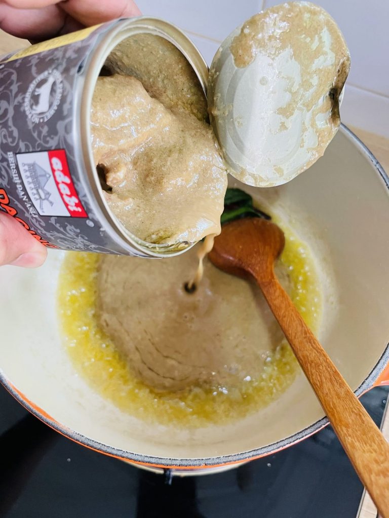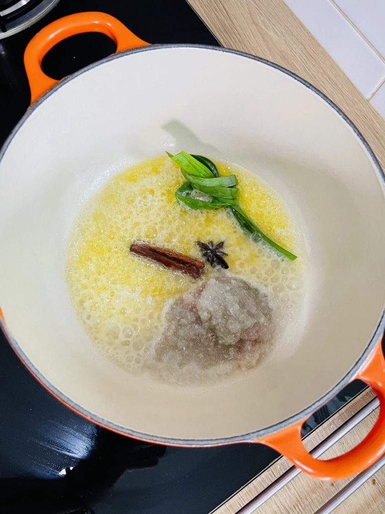 1. Panaskan minyak sapi/butter/minyak dan tumiskan bawang besar, bawan putih dan halia bersama kulit kayu manis, bunga lawang dan juga daun pandan sampai naik bau.