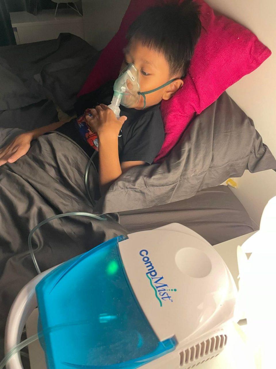Terus aku ambil nebulizer, pasang tepi katil, masukkan ubat tekan on.