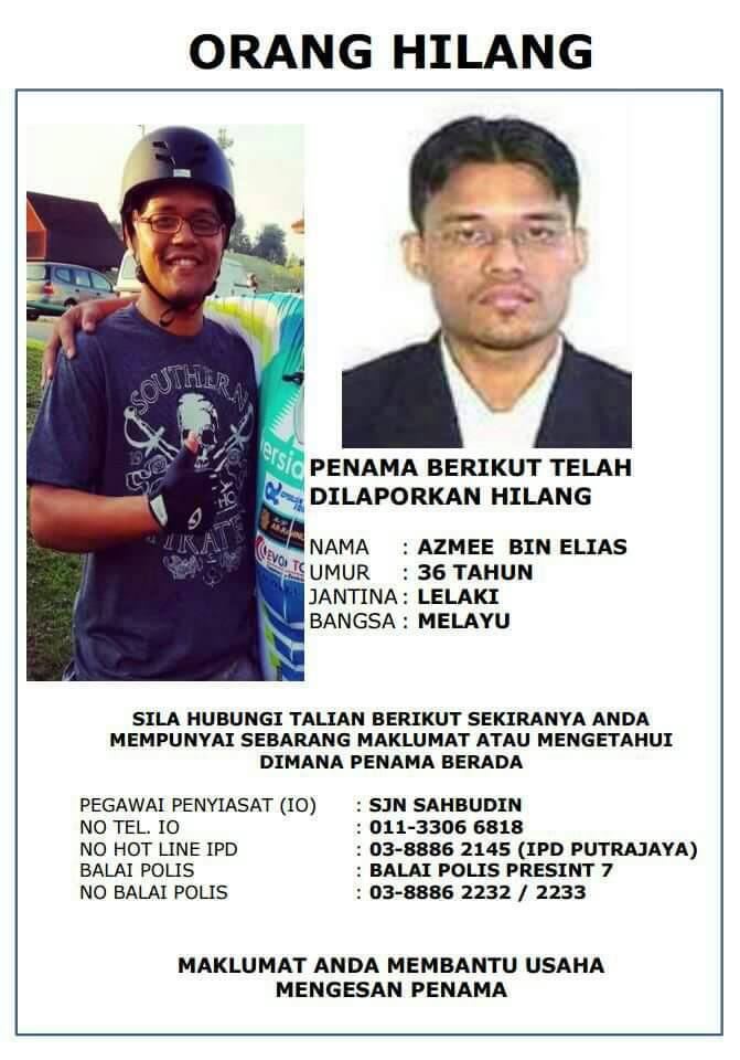 Kali terakhir Azmee dilihat adalah pada 12hb Februari yang lalu di tempat beliau bekerja iaitu di Mahkamah Syariah Kuala Lumpur dengan berpakaian pejabat baju gelap dan seluar kelabu.