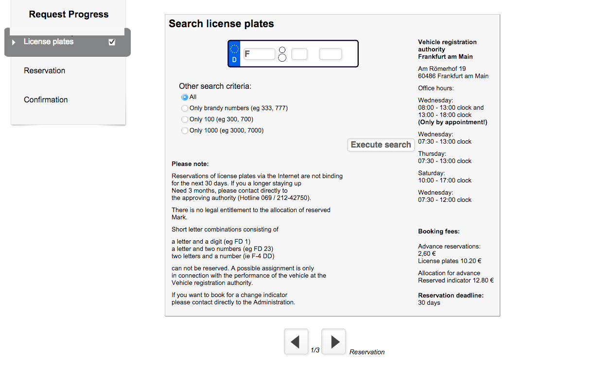 Gambar menunjukkan portal online untuk menempah nombor plet kenderaan di Frankfurt, Germany. Di Jerman tiada tender dikeluarkan untuk nombor plet kenderaan. Siapa cepat dia yang dapat atau anda boleh tempah (reserved) …