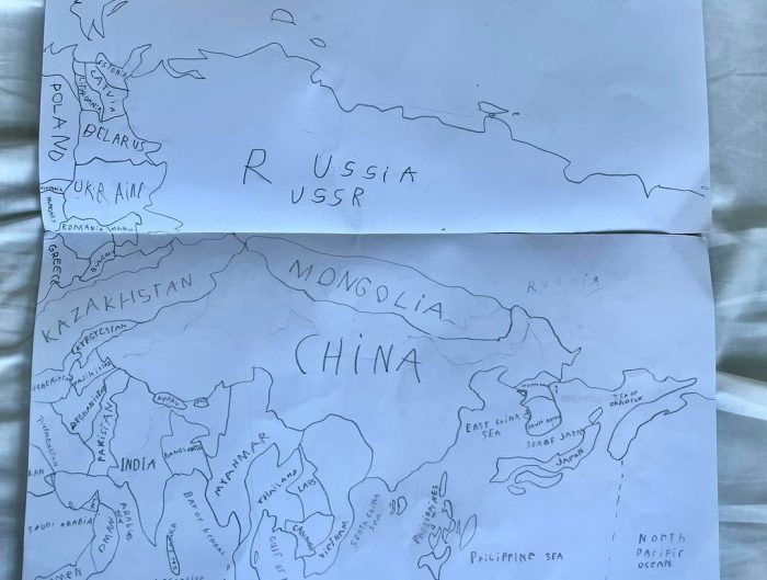 “Daddy, you should buy me a bigger drawing paper.” Katanya dia tak dapat nak lukis keseluruhan peta dunia. Tak muat. “See, I can’t draw Western Europe, North America, South America and all west …