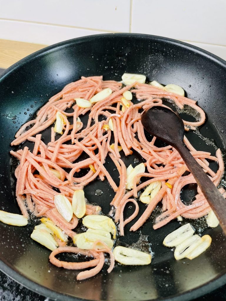 2. Tengok timer, tinggal 3 minit lagi pasta tu nak masak, terus panaskan minya zaitun dengan api sederhana, tumis bawang putih sekejap dan masukkan lof ayam. Kacau seketika kemudian masukkan garam, lada hitam dan chilli flakes.