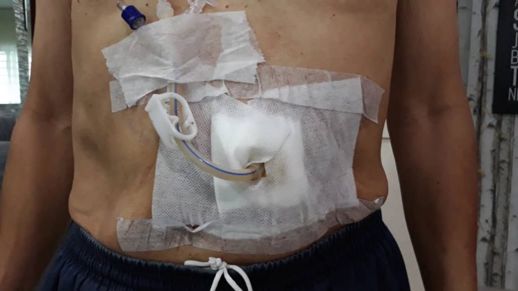 Bila diselak bajunya maka nampaklah tiub yang ditebuk masuk terus ke dalam perut. Itulah “mulutnya” kini dan selamanya.