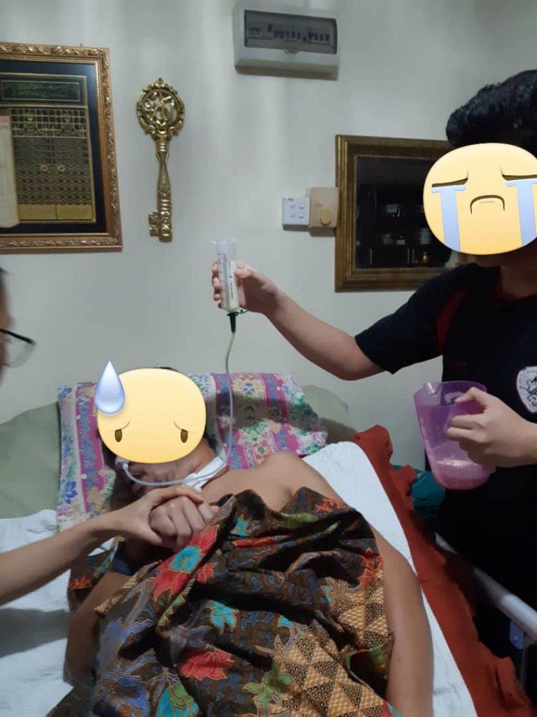 Maka terlantarlah beliau dan tidak mampu berbuat apa-apa lagi hatta bercakap sekalipun. Semuanya perlu dibantu dan makanannya hanyalah susu khas yang perlu diberi melalui tiub.