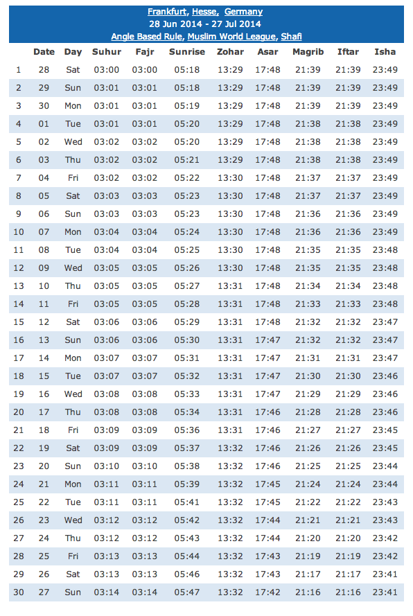 Sudah 4 tahun saya berpuasa di sini di mana bersahur pada jam 3 pagi dan berbuka pada jam 9.40 malam iaitu hampir 19 jam setengah waktu berpuasa. Alah bisa tegal biasa – sebab dah biasa jadi tak menjadi hal, cumanya di musim panas ni kena berjalan tunduk sentiasa sebab banyak dugaan dan pendedahan di jalanan.