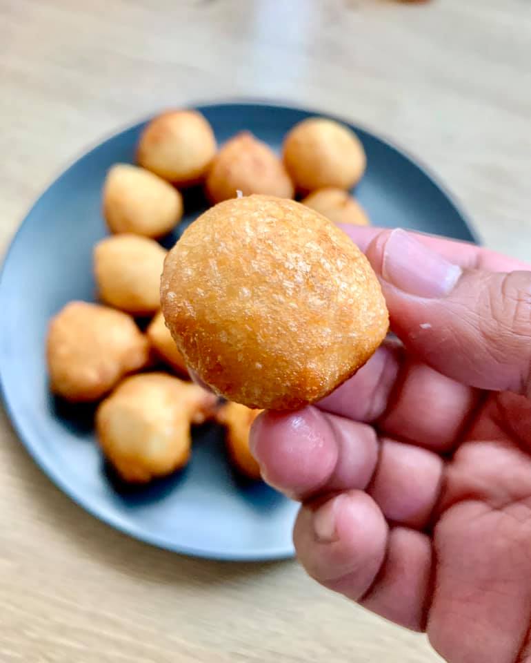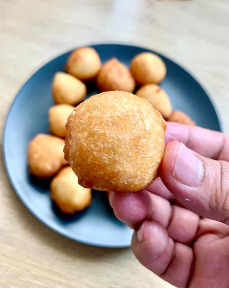 3. Guna dua sudu, basahkan dengan air dan ceduk adunan, bentukkan atau bulatkan guna dua sudu tu dan lepaskan ke dalam minyak panas.
