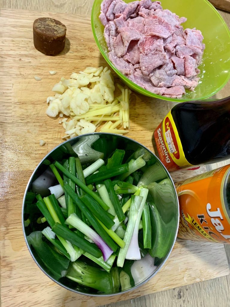 3. Dalam kuali yang sama dengan baki minyak tadi tumis bawang putih dan halia dalam 15-20 saat gitu dan masukkan air, gula melaka dan kicap. Gaul rata sampai didih dan masukkan sesudu tepung jagung lagi untuk bagi kuah pekat. Rasa dulu, tambah apa yang kurang.