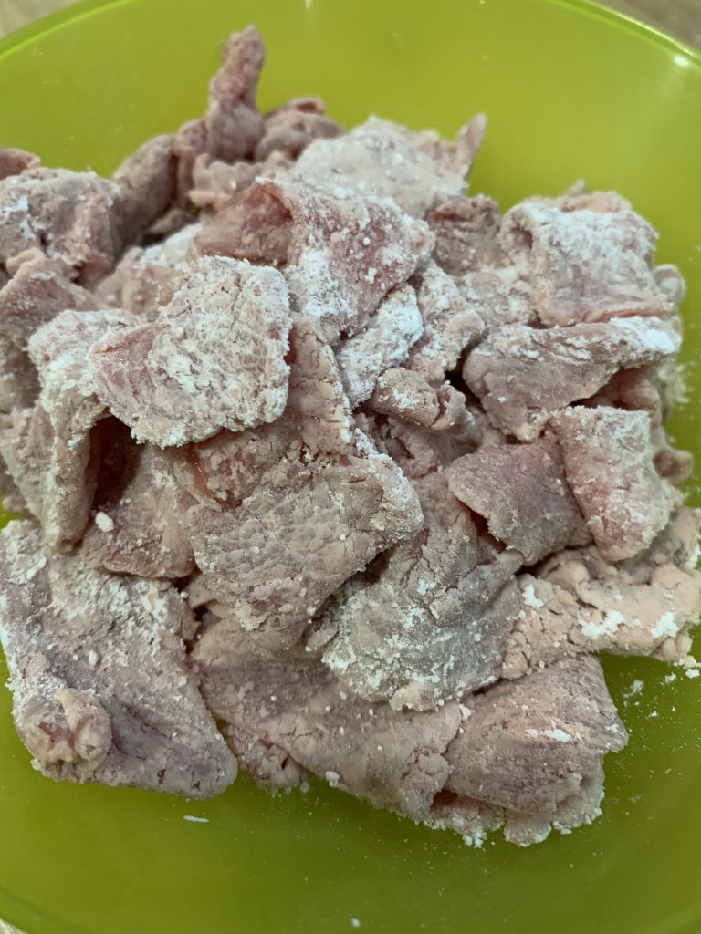 Lepas tu sadurkan daging dengan tepung jagung. TIPS, jangan campak terus semua dalam tepung atau campak tepung dalam daging. Kena ambik daging sekeping dua dan balik-balikkan atas tepung biar rata. Buat sampai habis dan ketepikan.