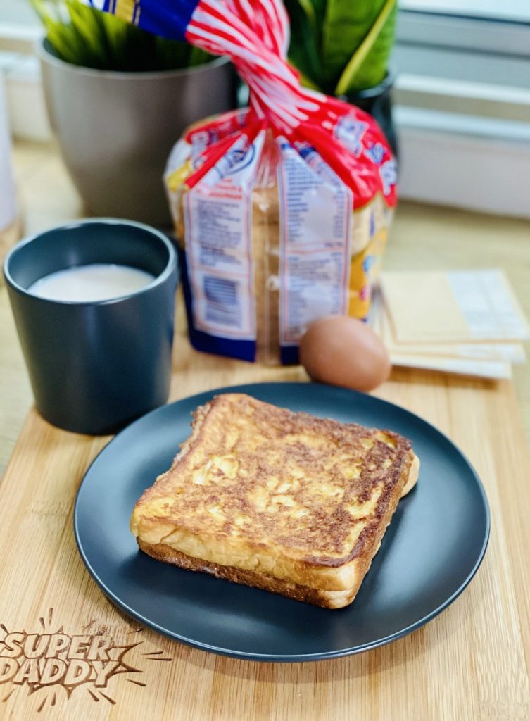 2. Panaskan kuali dan masukkan butter/marjerin. Masukkan roti dalam telur tadi dan biar telur balut sekata depan dan belakang dan letaklah atas kuali.
