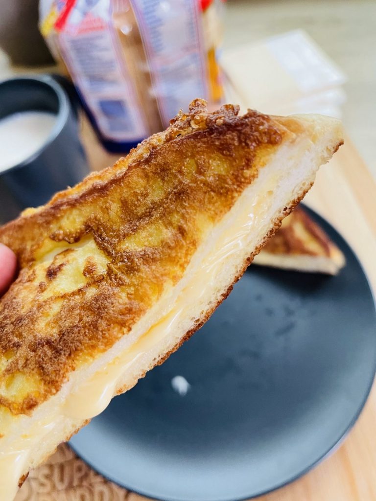 3. Ambil cheese dan letakkan atas dia. Lepas tu coat lagi sekeping roti tadi dengan telur biar sekata depan dan belakan dan letak atas cheese tadi.