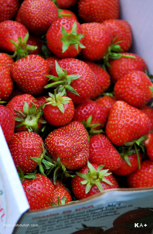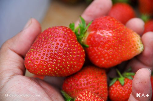 Kalau stroberi cameron ni memang rasa masam-masam manis. Tapi kalau nak beli yang ada manis sikit.. Stroberi imported from US. Besar-besar..sekotak RM25..Haha..Moga2 ada masa la nak buat..lagi2 ada pulak si kecik ni..