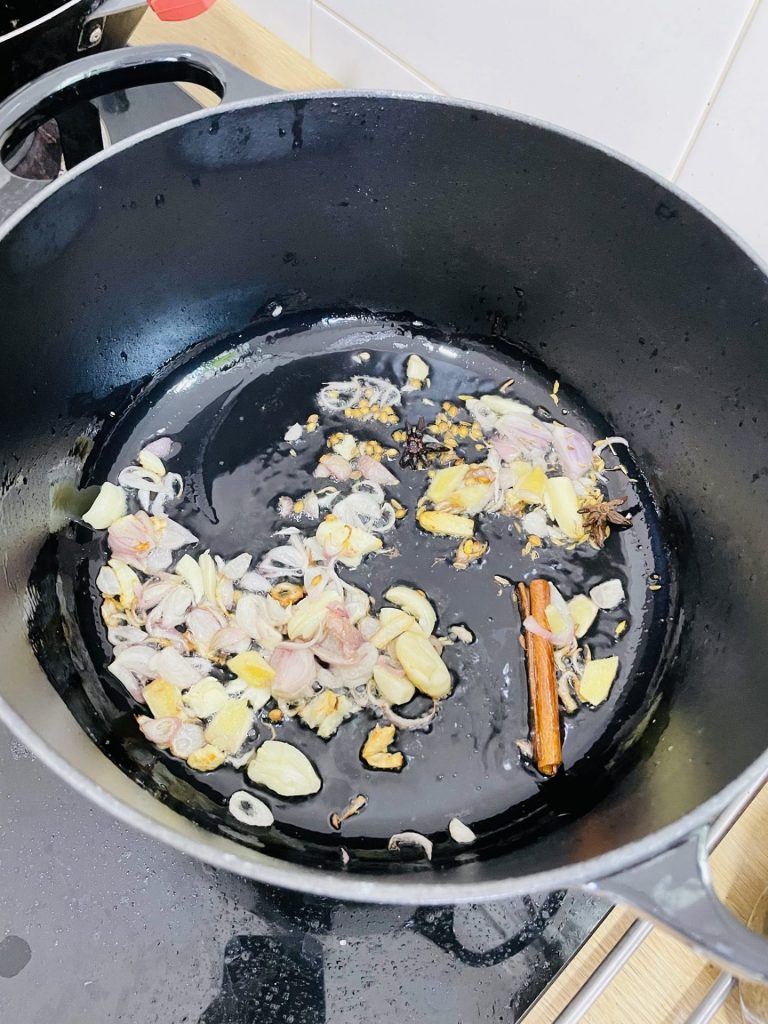 Tumis bawang merah, bawang putih, halia, ketumbar, jintan bunga lawang dan kulit kayu manis sampai naik bau.