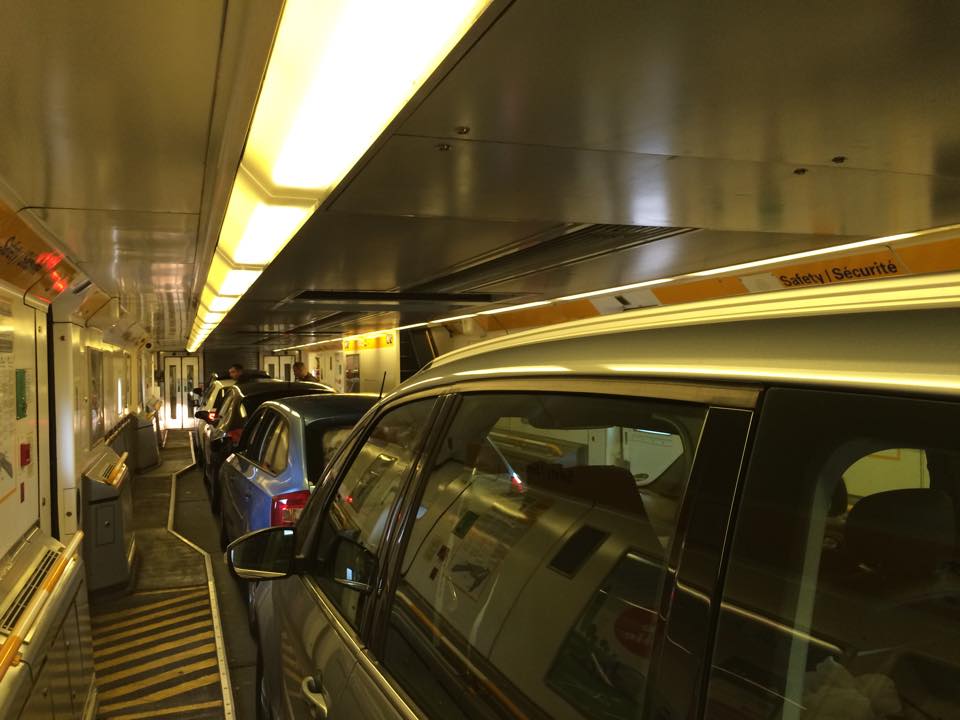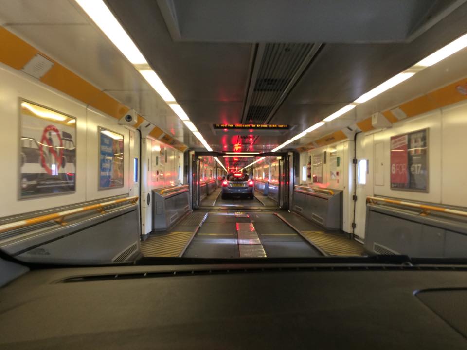 Beginilah keadaan di dalam keretapi Eurotunnel utk menyeberangi selat Inggeris menaiki kereta. Hanya 35 minit sahaja berbanding dengan feri iaitu 1 jam 30 minit. Namun tiketnya adalah lebih mahal iaitu sekitar €85-€180 berbanding feri iaitu €37-€80 sahaja untuk perjalanan sehala.