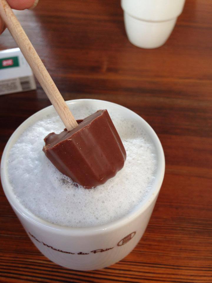 This is how we drink hot chocolate. A lolipop like chocolate is served with hot milk. Dipped in and enjoy.